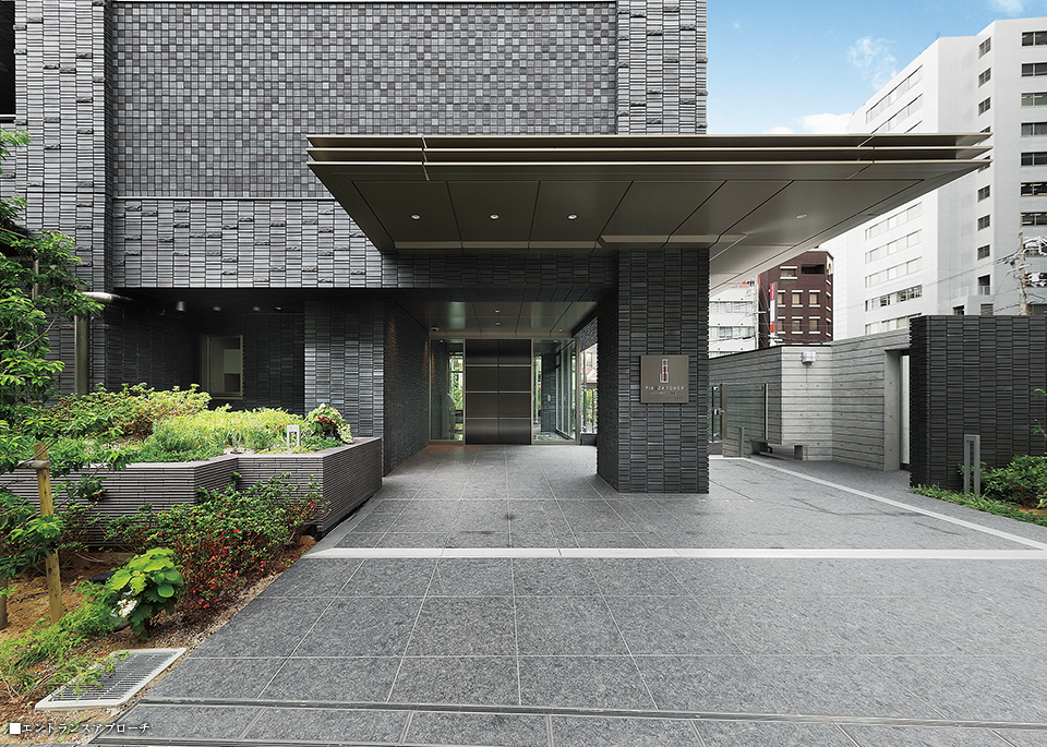 ダークグレーのタイルを基調とし、シンプルなフォルムで描いた30階建のモダンな外観デザイン。基壇部には形状の異なる3種類のタイルを使用し重厚感を演出。基壇部より上層階にはバルコニー手摺りや建物コーナーにガラス素材を使用。重厚感と軽快感の調和に配慮し、周辺への圧迫感を軽減。同時にグレータイルとのマッチングでスタイリッシュなイメージを際立たせています。