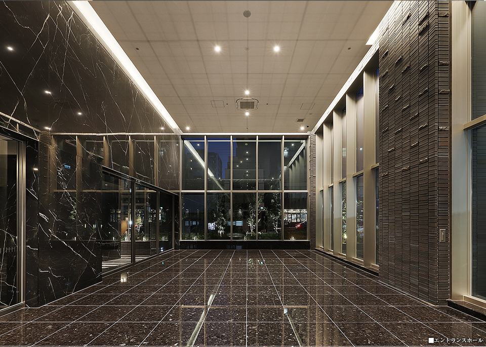 壁面には大判タイル、柱型には外部から連続する凹凸感のあるタイルを使用するなど、素材を厳選したエントランスホール。建物東南角に配置し、2層吹き抜け、3面ガラスの開放感にあふれる大空間を確保。南面と東面の大きなガラスウォールからやさしい自然光が注ぎ、ゲストの方との談笑のひとときを柔らかく包んでくれます。