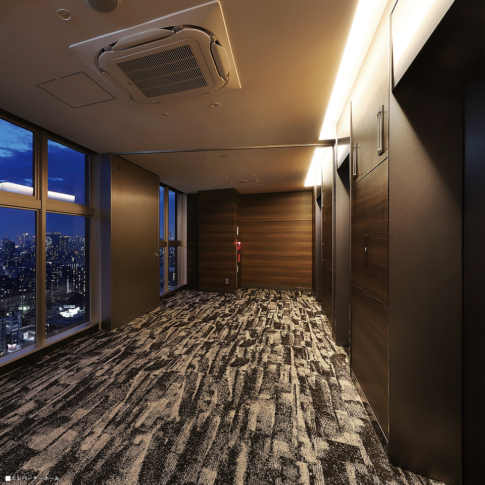 エレベーターを3基設置。エレベーターホールは、空間の広がりと高級感を演出する折上天井をしつらえ、間接照明を採り入れることで、落ち着いた雰囲気に仕上げています。エレベーターをゆったりとした心地で待っていただける上質な空間です。