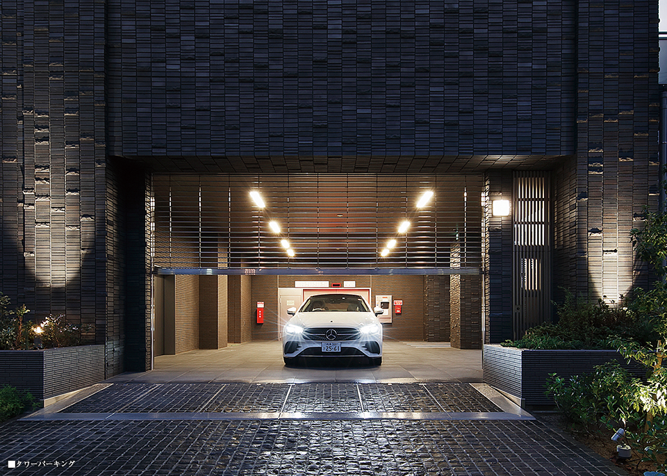 愛車が風雨にさらされることがなく、セキュリティ面でも安心なタワーパーキング。歩車道分離設計により、車の出入庫時の歩行者の安全にも十分に配慮しています。