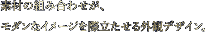 大きくシャープな形状の庇を配した、邸宅と呼ぶにふさわしい堂々とした風格を漂わす佇まい。庇上部の外壁タイルを他の基壇部のタイルと変えることで、アクセントを生み出しています。また、素材感のある天然石床のアプローチが住まう方々、訪れる人々を落ち着きと深い味わいを添えて迎えてくれ、私邸空間へと誘ってくれます。